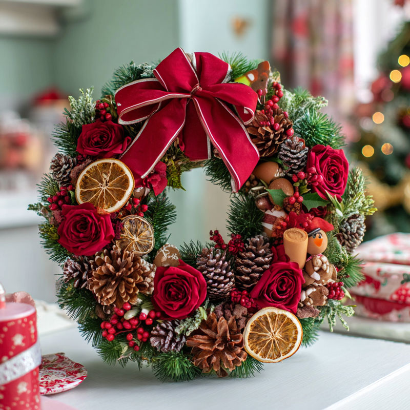 This lush Christmas wreath is a vibrant blend of seasonal warmth and elegant charm, ideal for dressing up Singaporean homes or doorways this holiday season. Crafted with fresh evergreen pine sprigs (frosted for a snowy touch), it features rich red roses, clusters of bright red berries, and natural pinecones for texture. Playful festive accents—dried orange slices, tiny decorative sweets, and a whimsical bird figurine—add cozy, rustic character, while a large glossy red bow (trimmed with gold) ties the look together with classic holiday flair. Durable and visually striking, this wreath is perfect for welcoming guests, decorating walls, or gifting to loved ones—bringing the cozy magic of Christmas to any space in Singapore.